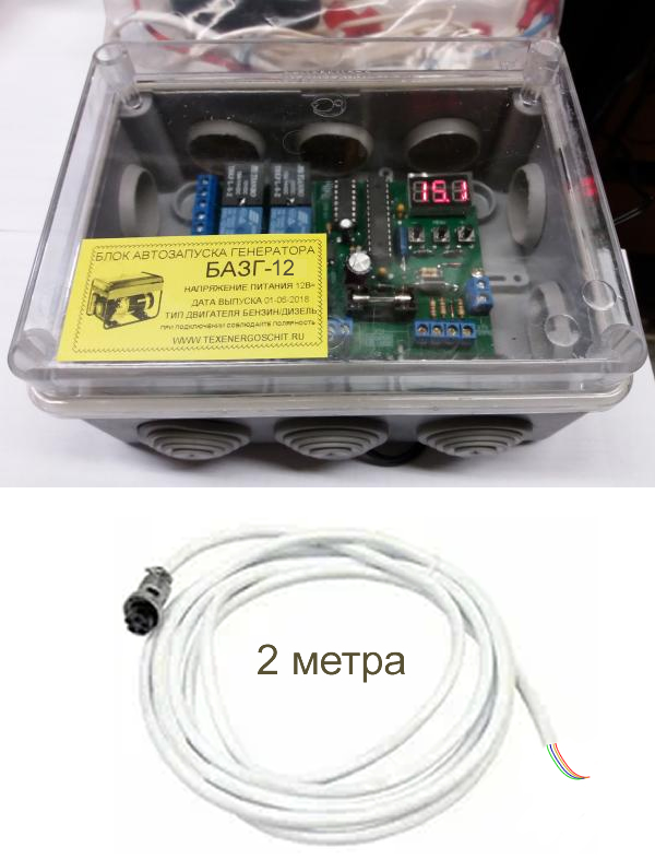Наименование товара: Блок автоматического запуска генератора БАЗГ-12 (для генераторов с разъемом под автоматику) плата + прозрачный корпус + кабель с разъемом 8pin 2 метра